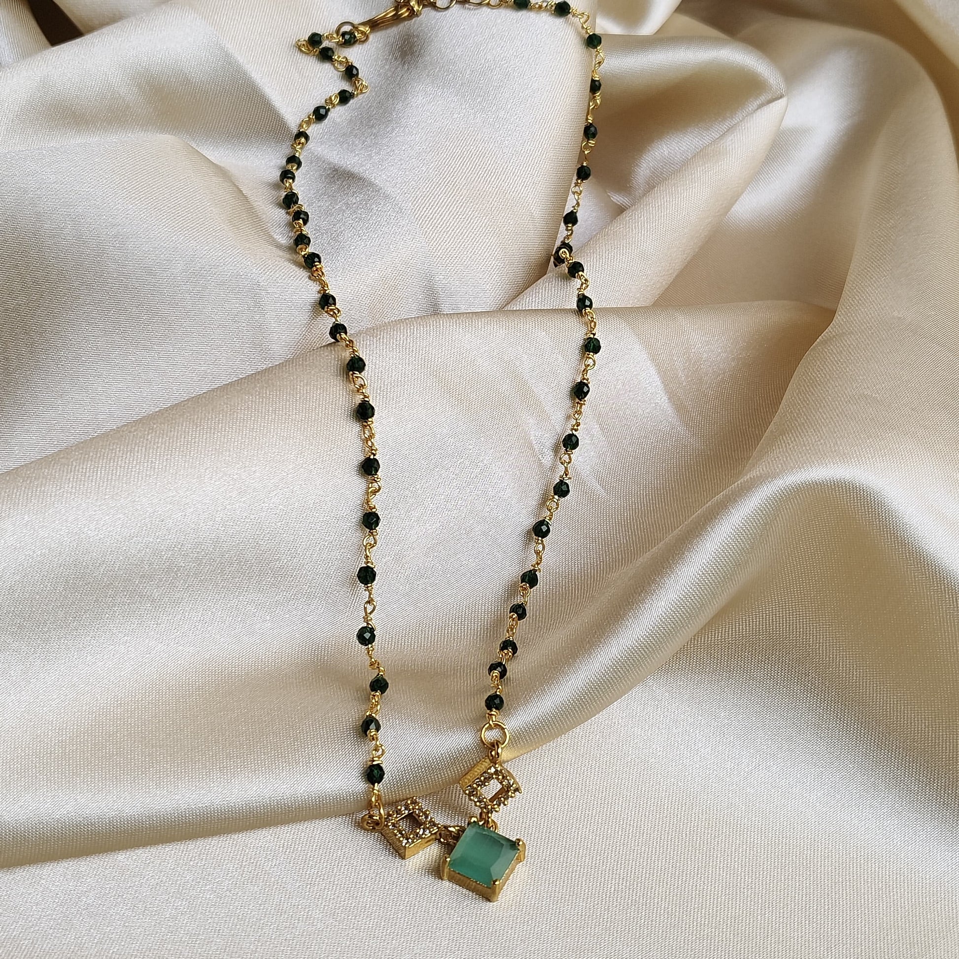 This beautiful necklace features a delicate gold-plated chain adorned with small, faceted green beads, creating a sophisticated and eye-catching design. The centerpiece of the necklace is a stunning, faceted mint-green or aquamarine-colored stone in a modern, square shape. It is suspended from two interconnected, open-square charms, each embellished with sparkling clear crystals, adding a touch of glamour. The intricate craftsmanship and combination of colors make this piece a perfect accessory for both special occasions and adding a refined touch to everyday wear.