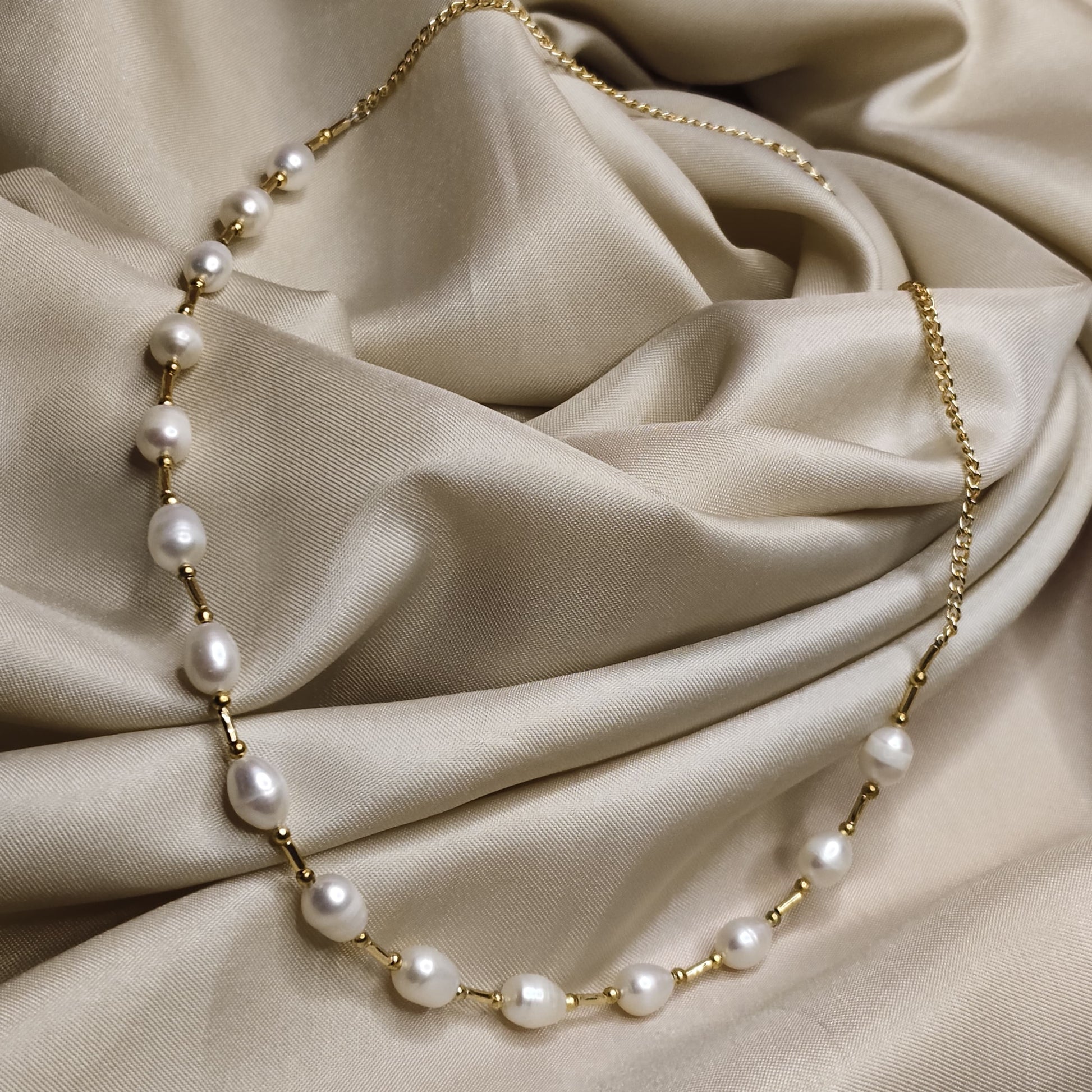 A timeless jewelry set featuring lustrous white freshwater pearls paired with elegant gold-coated. The necklace is gracefully designed with oval pearls spaced with golden accents, complemented by matching pearl drop earrings. Lightweight and elegant, this set is perfect for daily wear, festive occasions, and gifting.