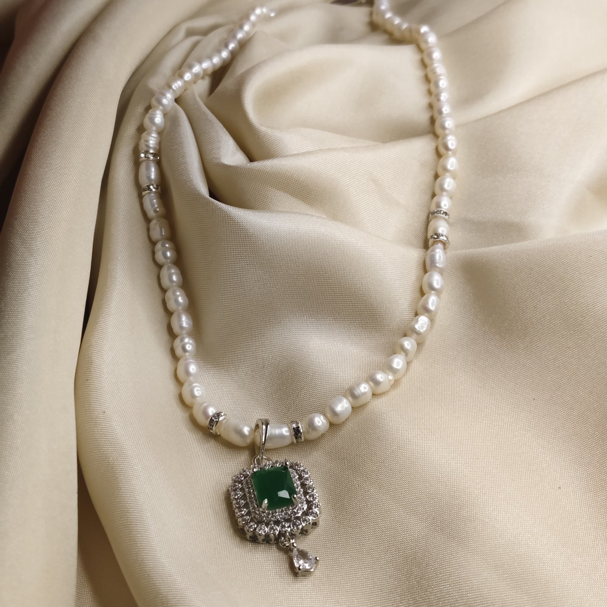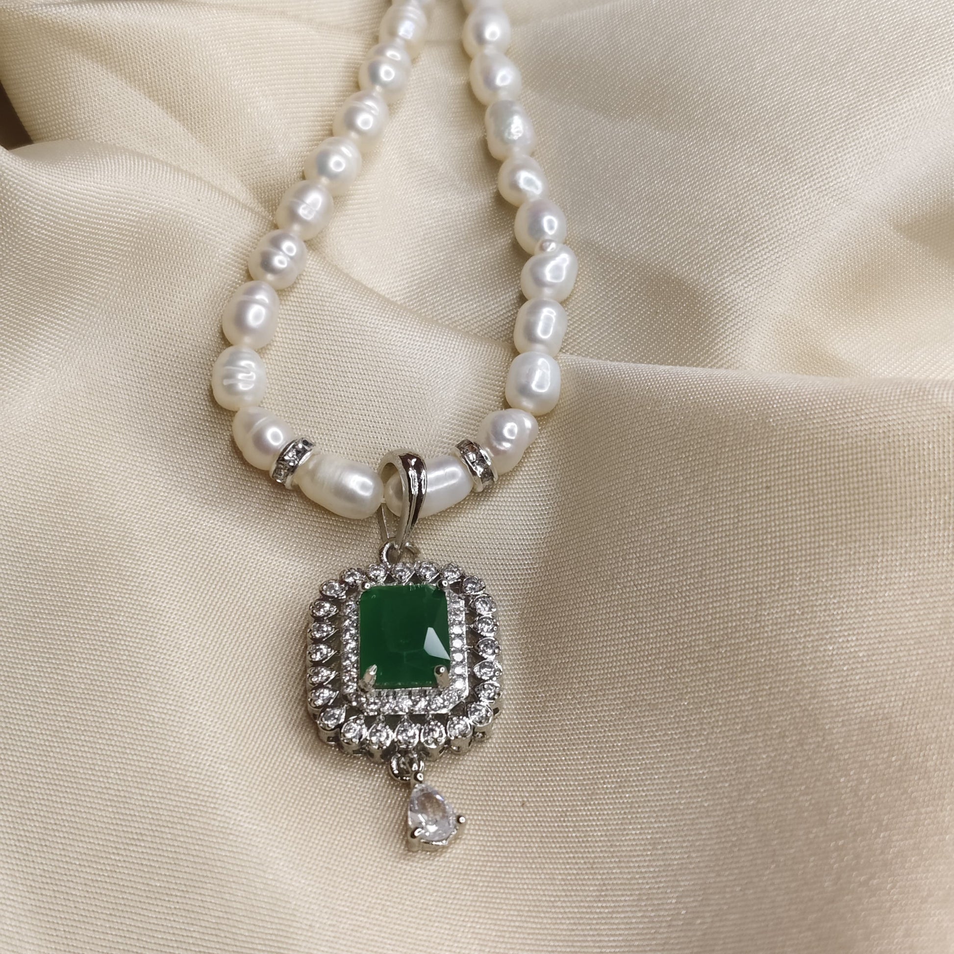 - Pendant: Emerald-green stone centerpiece surrounded by sparkling CZ stones, with a delicate teardrop accent