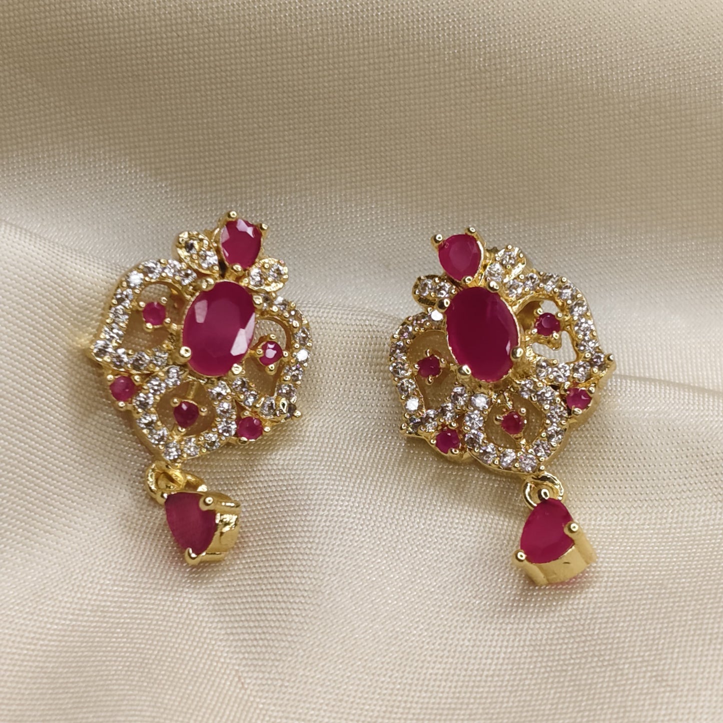 - Pendant & Earrings: Ruby-Red Stones with Gold-Coated Finish