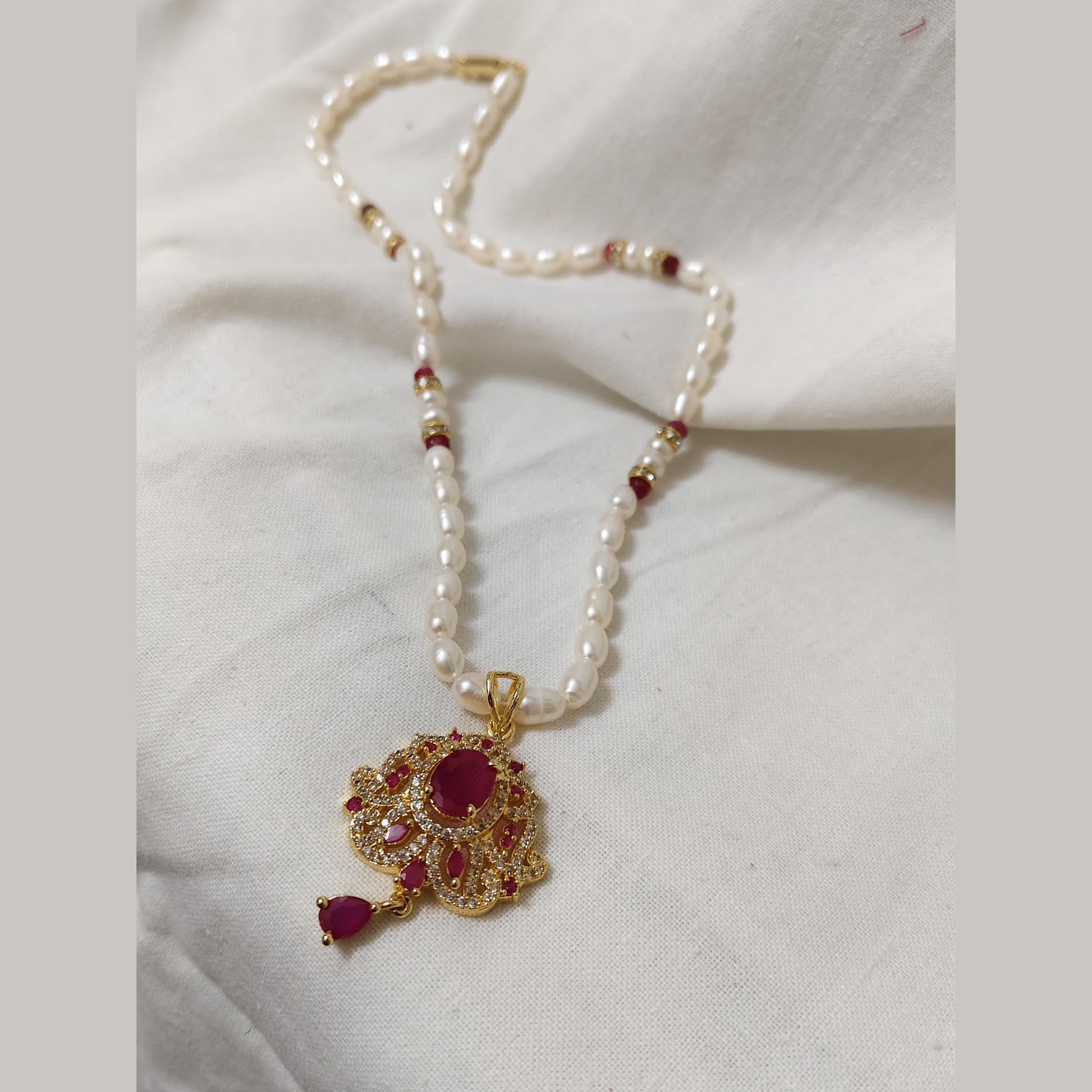 An elegant freshwater pearl jewelry set featuring a classic pearl necklace with a beautifully designed ruby-red stone pendant and matching earrings. The necklace is crafted with white oval pearls, accented by gold-coated, beads and ruby-red stone spacers, adding a touch of royal charm. The pendant and earrings are intricately designed with gold-coated finish and red stones for a traditional yet timeless look.