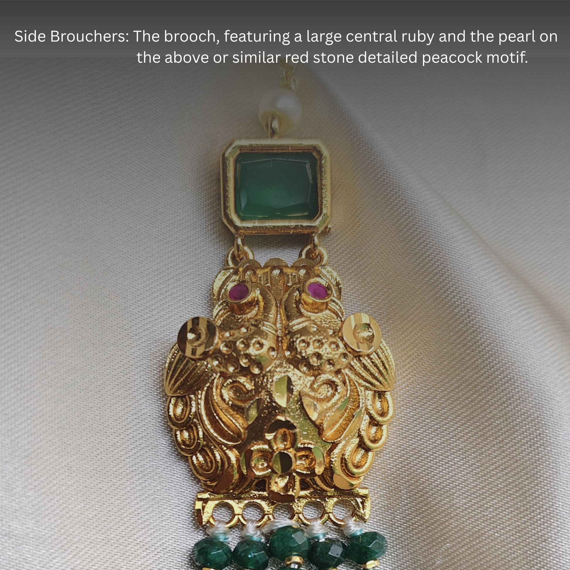 - Design: Multi-layered strands of pearls and emerald beads, connected by ornate gold-plated clasps with traditional motifs and square green stones.