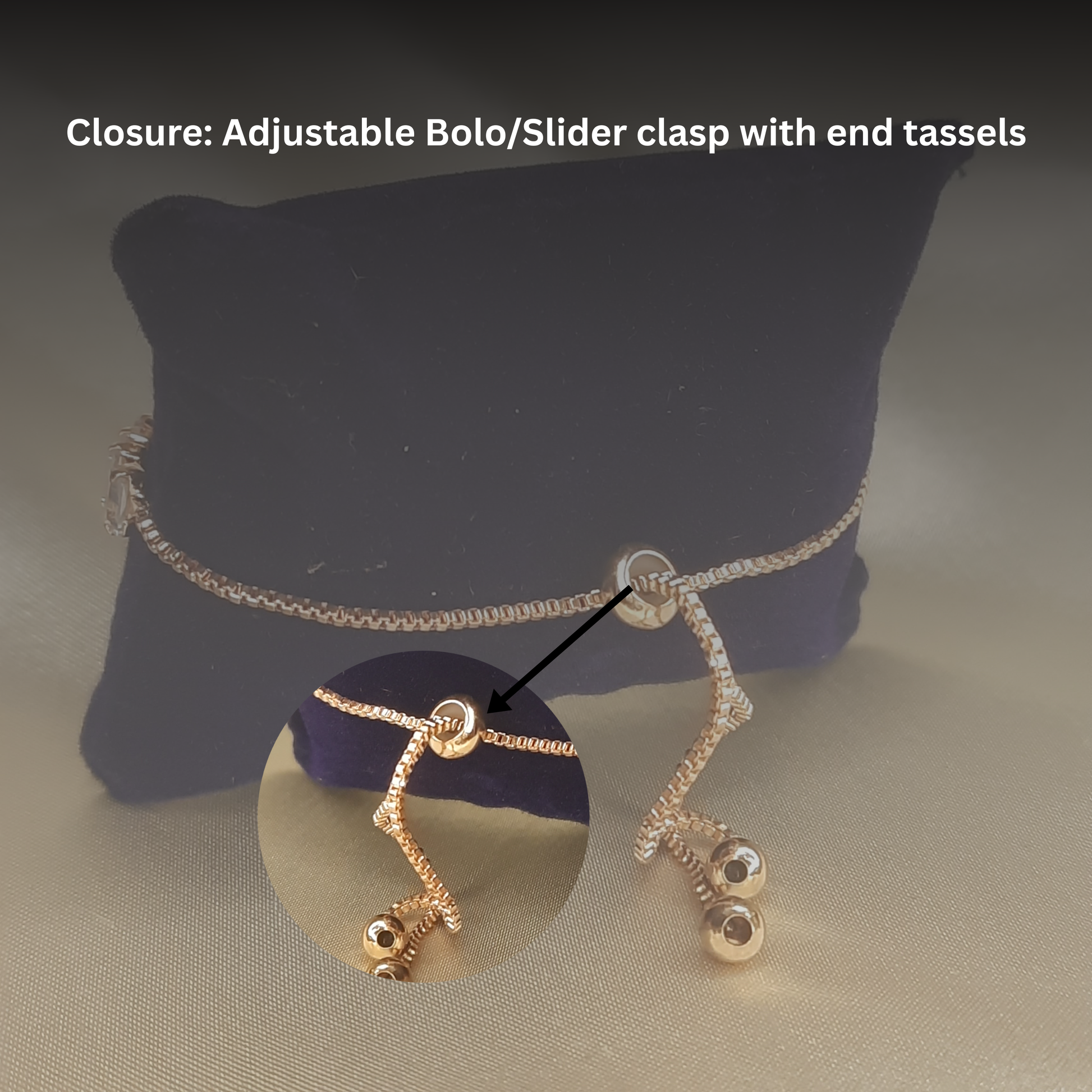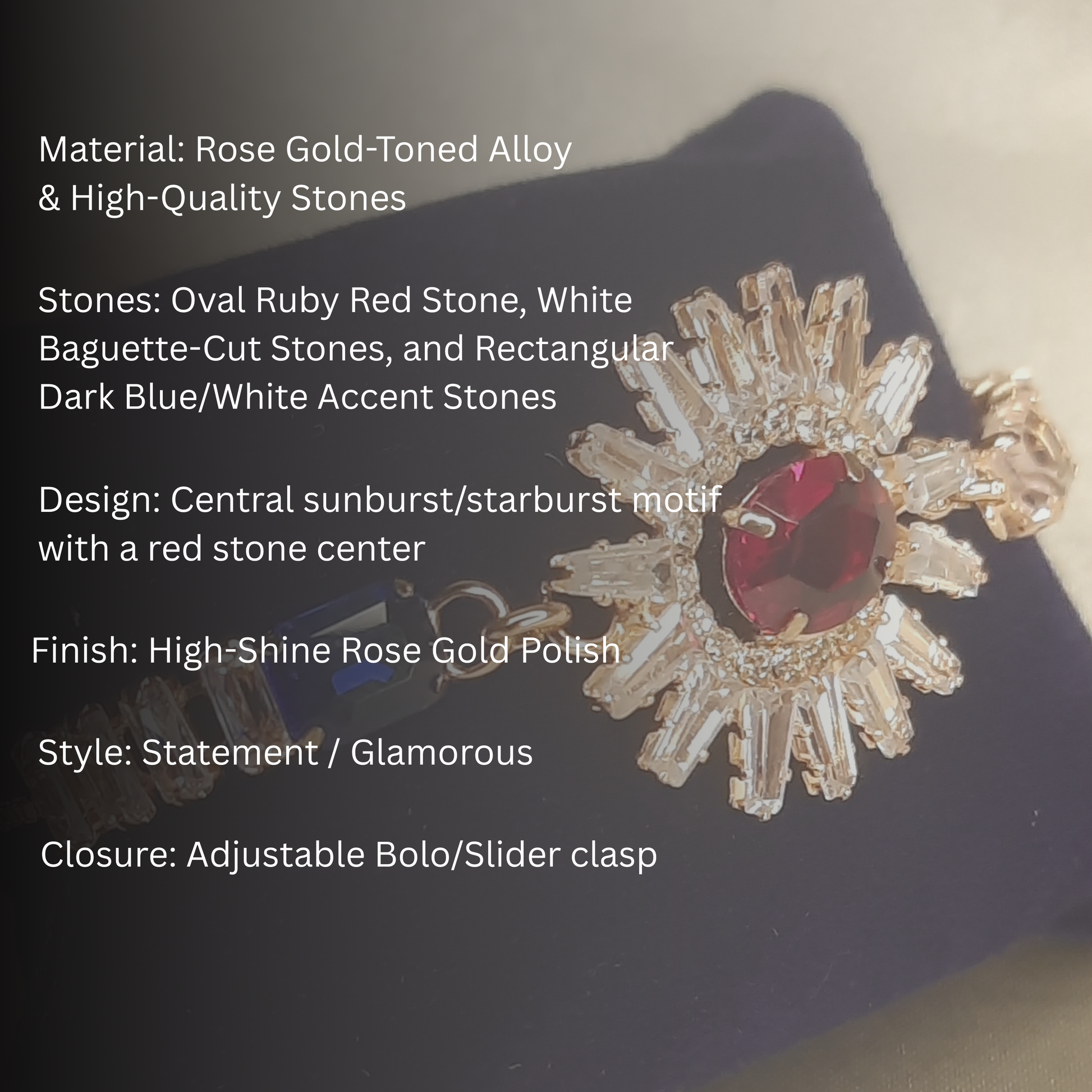 This breathtaking Helios Ruby Sunburst Bolo Bracelet is a captivating piece that brings radiant glamour to your wrist. The stunning centerpiece features a brilliant oval ruby red stone surrounded by a dramatic sunburst halo of sparkling white baguette-cut stones. This opulent design is set in a rose gold-toned finish and connected to an innovative bolo (slider) clasp and a delicate box chain, allowing for a perfectly adjustable and secure fit.
