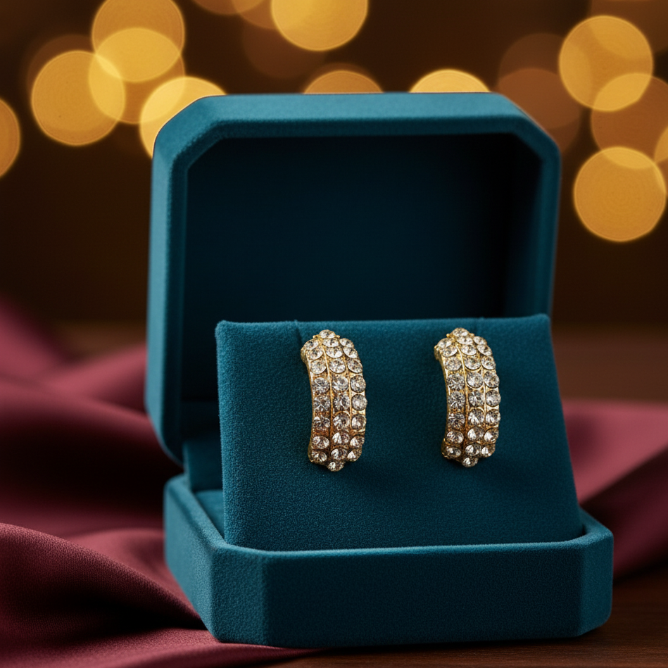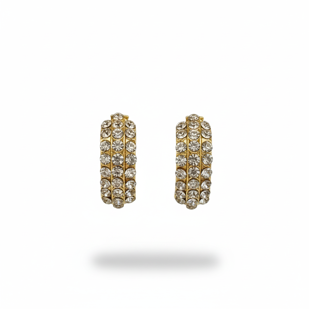 These dazzling Lumina Triple-Row Hoops are the ultimate statement in radiant glamour. The earrings feature a chunky, contemporary hoop design, completely covered in three continuous rows of meticulously set brilliant-cut white stones. The gold-toned finish provides a warm contrast, allowing the stones to shimmer with exceptional fire. These earrings are designed to catch the light and instantly elevate any evening or party ensemble.