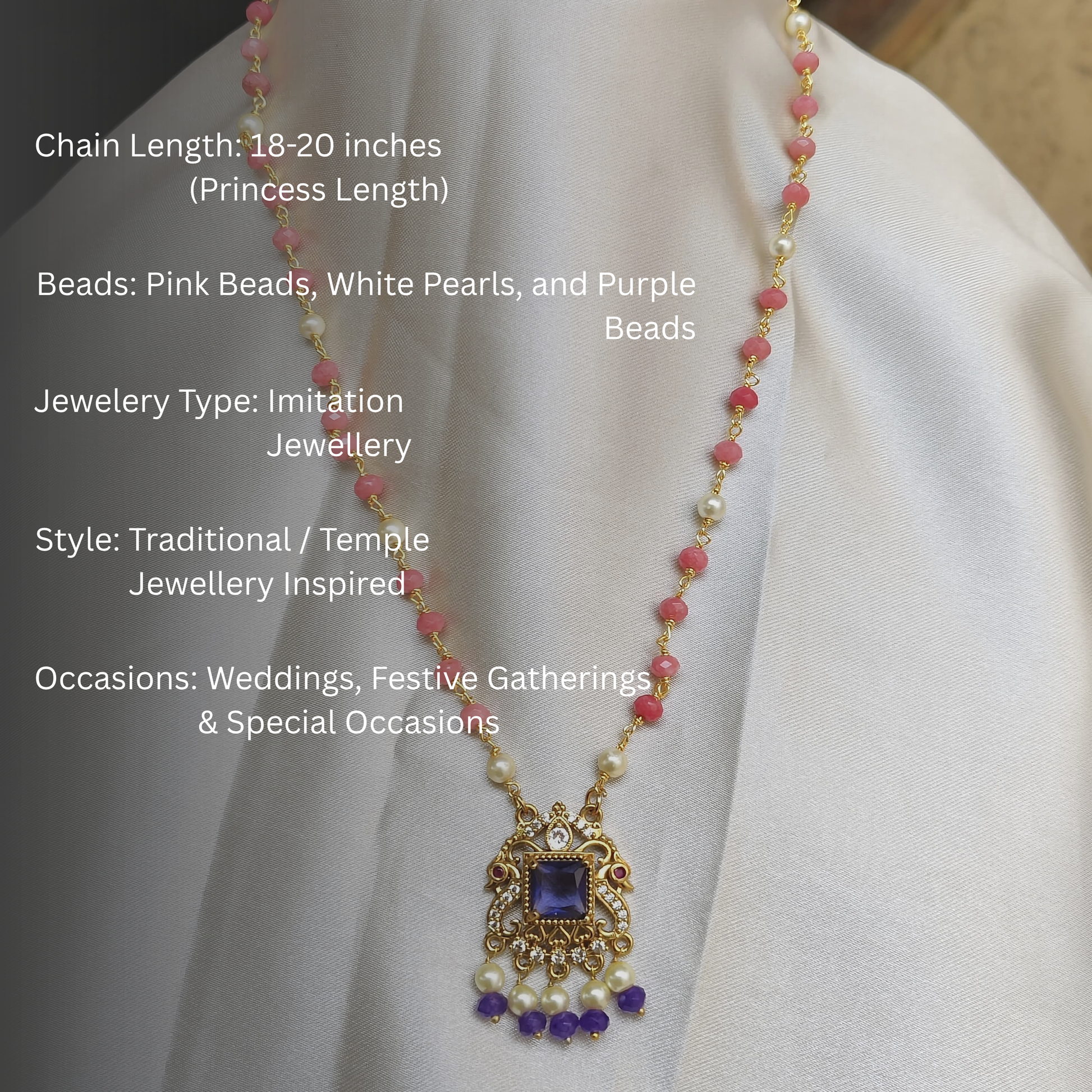 Elevate your traditional look with this striking Neela Kundan Necklace. This elegant piece features a beautifully crafted gold-plated pendant, centered with a stunning, deep blue stone and surrounded by intricate Kundan work and dazzling white accents. The necklace is strung with lustrous pink beads and delicate white pearls, creating a soft, colorful contrast to the bold pendant. Dainty clusters of purple beads and pearls dangle gracefully from the bottom, adding a final touch of sophistication.